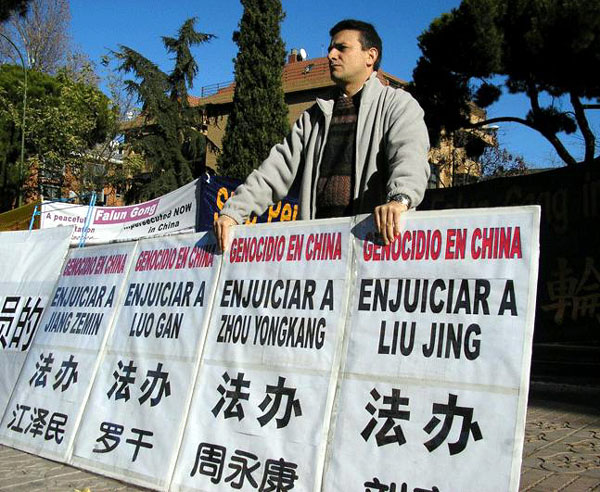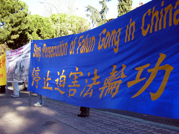 (Clearwisdom.net) On December 17, 2005, Falun Gong practitioners from Madrid went to the Chinese Embassy and held a peaceful protest to strongly condemn the rape of two practitioners by a Chinese Communist Party (CCP) policeman and demand that the Chinese Communist regime hold the rapist accountable. In addition, the practitioners read a Falun Dafa Association announcement, calling on Embassy staff members to stop assisting the CCP in the persecution and choose to be good for the sake of their own futures.