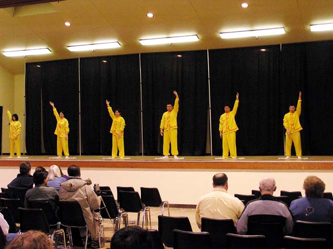 Near the end of the first day's activity, a man came up in a hurry. He said, while reading a flyer, "Free information, free teaching. I need both of these." He learned the first three sets of the exercises and then left reluctantly because he had to go work.