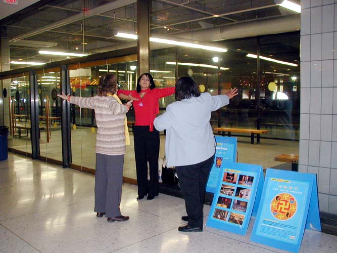 About half of the people already knew about or had heard of the persecution, while the rest heard about Falun Gong for the first time. Many people signed their names to help stop the persecution. One woman said that it was the third time for her to meet Falun Gong practitioners. The first time was in Boston, then Manhattan. This time, she said she would read the newspaper carefully and learn more about Falun Gong.