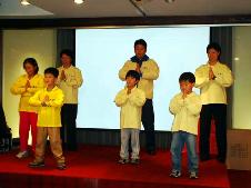 Two families of Falun Gong practitioners demonstrated the Falun Gong exercises. The audience welcomed them with warm applause. The audience was fascinated by the beautiful exercises and the smooth and slow movements. Even the loud dance music coming from another part of the same restaurant couldn't disturb the young practitioners' concentration.