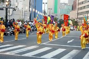 (Clearwisdom.net) On May 4, 2005, Fukuoka's annual cultural festival was held and around 2.1 million residents enjoyed various performances and activities. So that the Japanese people could experience the grace and beauty of Falun Gong, more than 100 practitioners participated in the grand parade and received a warm welcome from spectators along the parade path.