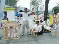 It is becoming hotter and hotter. Practitioners who demonstrate the torture methods hold their postures without a break for several hours in a row. Many spectators asked, "Are they real people?" Practitioners answered, "They are real persons. In fact, this kind of cruel persecution is happening in China every day and it has been going on for six years. Here, we expose the Chinese Communist regime's suppression of Falun Gong and call on kind-hearted people to work together and help stop the human rights violations in China."