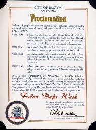 (Clearwisdom.net) On June 11, 2005, Philip B. Mitman, Mayor of the City of Easton, Pennsylvania, commended the individuals practicing Falun Dafa for seeking to enrich their lives and for peacefully resisting an unjust violation of their human rights, urged the People's Republic of China to immediately cease persecution of Falun Dafa, and proclaimed the week of June 6 through June 12, 2005, as Falun Dafa Week in the City of Easton.