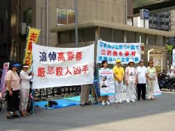 (Clearwisdom.net) Practitioners were shocked upon hearing that practitioner Gao Rongrong was tortured to death by the Chinese Communisty Party (CCP). For her unyielding faith in Falun Dafa, Ms. Gao's face was disfigured in May 2004 after more than 6 hours' shock by electric batons. She was again abducted and detained for further persecution in March 2005, and she died on June 16 due to failure of internal organs. In the morning of June 21, practitioners in Kinki area gathered in front of Chinese consulate at Osaka to protest CCP for the killing of Ms. Gao.