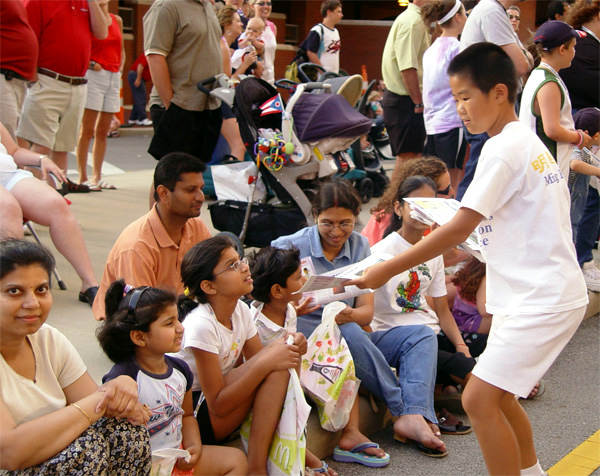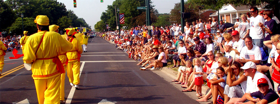 (Clearwisdom.net) Independence Day parades provide excellent opportunities for Americans to promote the spirit of democracy, and they are also good platforms for practitioners to present the beauty of Falun Dafa to Americans. Over the past several years, Falun Gong has been the only Asian group participating in the annual Columbus Independence Day Parade. This year, on the afternoon of July 1 and the morning of July 4, local practitioners participated in the Columbus and Upper Arlington Independence Day parades respectively. Practitioners performed on the traditional Chinese waist drums for the first time for Ohioans.