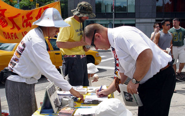 (Clearwisdom.net) On the morning of August 6, 12 Toronto practitioners went to Columbus Circle in Manhattan to clarify the truth of the ongoing persecution of Falun Gong to New Yorkers. Though it was exceptionally hot, there were many passersby, and they were greatly shocked and outraged by the truth of the brutal persecution. A large number of people signed our petition to show their support.