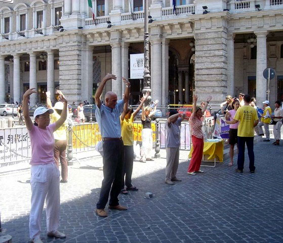 There were crowds of people in Rome during July. Many touring groups from China were shocked when they saw there were so many Western Falun Gong practitioners. Some asked for leaflets, while more of them excitedly took pictures. Many Italian people and tourists from other countries signed petitions supporting Falun Gong and condemning the savage acts of the Chinese Communist Party (CCP). Many people shed tears after viewing the pictures of torture used in attempts to force practitioners to renounce their beliefs.
