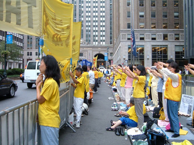 (Clearwisdom.net) On the evening of September 11, 2005, Hu Jintao's delegation left Toronto to visit Mexico. On September 13, Hu and his delegation traveled to New York to attend the UN World Summit, and left on September 16. I joined some of my fellow practitioners from Toronto to go to New York to take part in several activities, including introducing Falun Dafa to local people, clarifying the facts about Falun Gong, and conveying our messages to Hu's delegation.