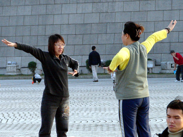It was a sunny day with a clear sky. On the square, there were many tourists from Taiwan, Mainland China, Japan, Korea, Singapore, U.S., Canada, Britain, France, Holland and Israel. Among the people who stopped and watched the exercises with interest, some knew about Falun Gong and some had never heard of it. The exercise group seemed to be the major point of interest, and visitors watched the practitioners, read the introduction material, and took some photos.