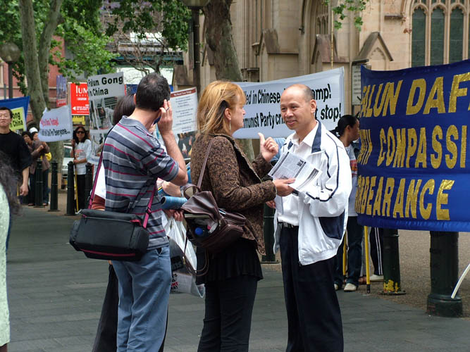 (Clearwisdom.net) On October 6, 2006, Falun Gong practitioners from Sydney assembled in front of City Hall to hold an activity to protest against Bo Xilai, the Chinese Minister of Commerce, and one of the main culprits in the persecution of Falun Gong. They also exposed the Chinese Communist Partys (CCP) crime of harvesting organs from living Falun Gong practitioners, and other CCP atrocities in the persecution.
