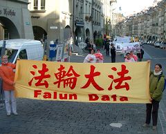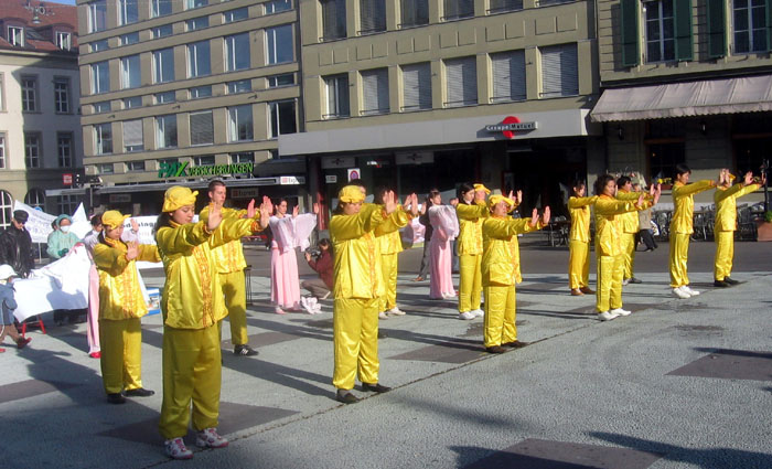 (Clearwisdom.net) On November 4, 2006, Falun Gong practitioners from Switzerland and Germany held a parade in the Swiss capital city of Bern to expose the Chinese Communist Party's (CCP) atrocities of harvesting organs from living practitioners and supporting the 15 million Chinese people who have publicly quit the Chinese Communist Party and its affiliated organizations. At the end of the parade, the practitioners held a press conference at Waisenhausplatz Square. Many passersby were attracted by this unique parade procession, the demonstration of the beautiful Falun Gong exercises, and the powerful press conference. Many passersby accepted practitioners truth-clarification hand-outs. After hearing a speech exposing the CCP atrocities of harvesting organs from living Falun Gong practitioners, many of them immediately signed a petition demanding an end to the brutal persecution of Falun Gong.