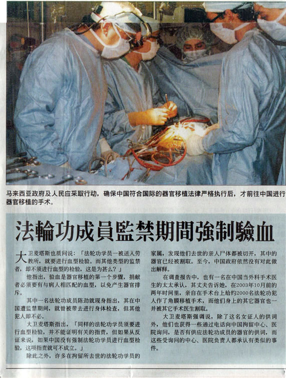 The article detailed David Matas' speech at a forum on October 10th hosted by the Malaysian Bar Association. The article emphasized that the number of organ transplantation surgeries increased dramatically after 2001 and the sources of the organs used are questionable.