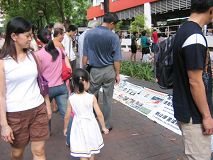 Prior to this activity, practitioners in Singapore conveyed the above mentioned messages to people in other areas, as well. Police in some places directly removed practitioners display boards. Some police officers said that we were breaking the law with too many display boards. With an excuse of conducting an investigation, the police took away the practitioners display boards. Singapore Falun Gong practitioners said that they have not contravened the public entertainment law limiting the number of display boards, because the display boards are not meant for entertaining anybody. The police brought false charges against Falun Gong practitioners and deprived citizens of their constitutional, basic human right of freedom of speech.