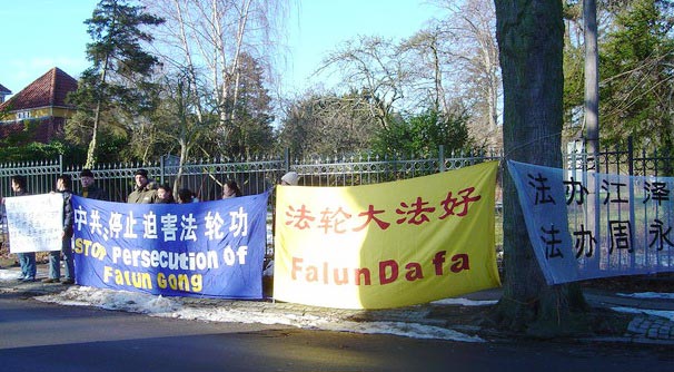 (Clearwisdom.net) On February 11th, practitioners gathered in front of the Chinese Embassy in Copenhagen to protest the vicious attack on American Falun Gong practitioner, Dr. Li Yuan. Thugs also broke the door of the key person in charge of NTDTV in France, to steal money.