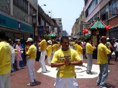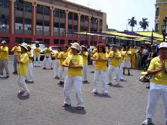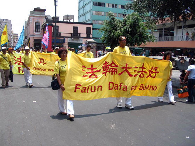 (Clearwisdom.net) In Chinatown in Lima, capital of Peru, people were delighted to see a graceful parade on January 29, Chinese New Year. From the banner "Truthfulness, Compassion, Forbearance," "Falun Dafa" and "Falun Dafa is Good," to yellow T-shirts, people realized this was a parade of Falun Dafa practitioners.