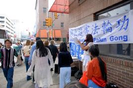 At noon on Sunday, it was raining, but the Falun Gong practitioners came to Chinatown as usual. They held up banners, exposed the CCP's heinous crimes to the public and demanded an immediate end to the persecution of innocent Falun Gong practitioners. It happened to be the last day of a flower exhibition in Philadelphia, and many people came to Chinatown, which is nearby the exhibition. They accepted flyers about the CCP's crimes while listening to the practitioners' truth clarification broadcasting. An officer from Philadelphia's Police Department was on duty on No. 10 Street. He said that he had learned about the atrocities and expressed his support for the practitioners.
