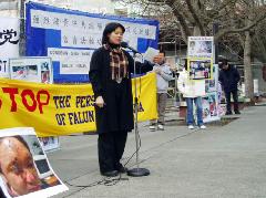 (Clearwisdom.net) Falun Gong practitioners from the Seattle area held a press conference on March 18, 2006, in a Chinatown park to protest the Chinese Communist Party's secret Sujiatun Concentration Camp, which has jailed at least 6000 Falun Gong practitioners, harvested their organs, and sold them for profit. Protestors held banners stating, "We Strongly Condemn the CCP Sujiatun Concentration Camp's Cremating Falun Gong Practitioners and Selling Their Organs." Display boards were set up at the site and practitioners passed out truth-clarifying flyers to passersby.