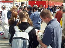 After the press conference, the practitioners demonstrated the Falun Gong exercises in the square, and solicited supporting signatures. In the meantime, some practitioner acted out the cruel torture methods employed in China's forced labor camps against Falun Gong practitioners. They also performed an imitation show of harvesting living human organs in China's forced labor camps. When seeing the peacefulness of the Falun Gong exercises against the cruelty of the persecution, many people were deeply moved. In the meantime, they were really shocked by the CCP's evil and inhuman nature.
