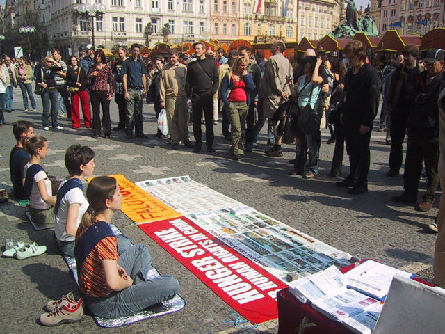 Clearwisdom.net) On March 22nd 2006, in the historic centre of Prague, a hunger strike protest took place. Practitioners of the Czech Republic aimed to inform people about the Chinese death camps, where organs are taken from living Falun Gong practitioners. Organs are then being sold for profit. During the presentation, many passers-by stopped to sign the petition calling for justice for practitioners.