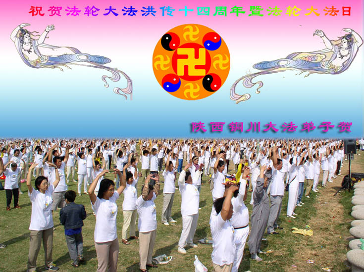 Falun Dafa Practitioners from Tongchuan, Shan'xi Province Respectfully Wish Revered Master Happy Birthday and Celebrate the Fourteenth Anniversary of Falun Dafa's Public Introduction!