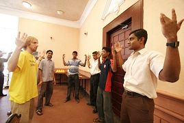 What is special about this conference is that before the sharing, practitioners demonstrated the exercises. All the guests to the conference were willing to learn the exercises. The guests were divided into several groups and each group had a practitioner to teach the exercises. The people in Sri Lanka are pure and kind. They learned the exercises quicky. Some of them bought copies of Zhuan Falun and told practitioners that they would cultivate Falun Gong.