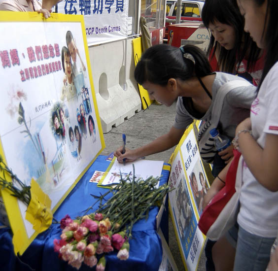 In Mainland China, many mothers are jailed in prisons or labor camps, just because they practice Falun Gong. What they are facing are brainwashing, torture, rape, and other atrocities, including harvesting organs. Mothers don't have the right to talk to their families. Today, we cannot even call them and say "Happy Mother's Day." Several mothers from Hong Kong, who are also Falun Gong practitioners, Xiao Wenhong, Liang Zhen, Kuang Senqia, came to the activity, calling for support. They also told citizens the mothers' stories of cultivation and being persecuted by the CCP. Many citizens signed their names.