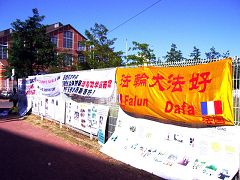 (Clearwisdom.net) During the World Cup 2006, China and France had a Friendly International Match at the Geoffroy Guichard Stadium in Saint Etienne at 8pm on June 7. Falun Gong practitioners in France went to the stadium and took the opportunity to expose the persecution over the past seven years. They hung banners, set up display boards and told people through a speaker about the CCP's crime of harvesting organs from living Falun Gong practitioners. Their colorful balloons printed with "Falun Dafa Is Good!" and "The World Needs Truth-Compassion-Tolerance" were very popular. TV France 3 took video of the activity and interviewed practitioners.