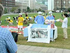 Falun Gong practitioners from Ottawa and Montreal used many methods to let people know how the group is being persecuted in China, including staging a re-enactment of the CCP's organ harvesting from living Falun Gong practitioners. Their displays attracted many visitors.
