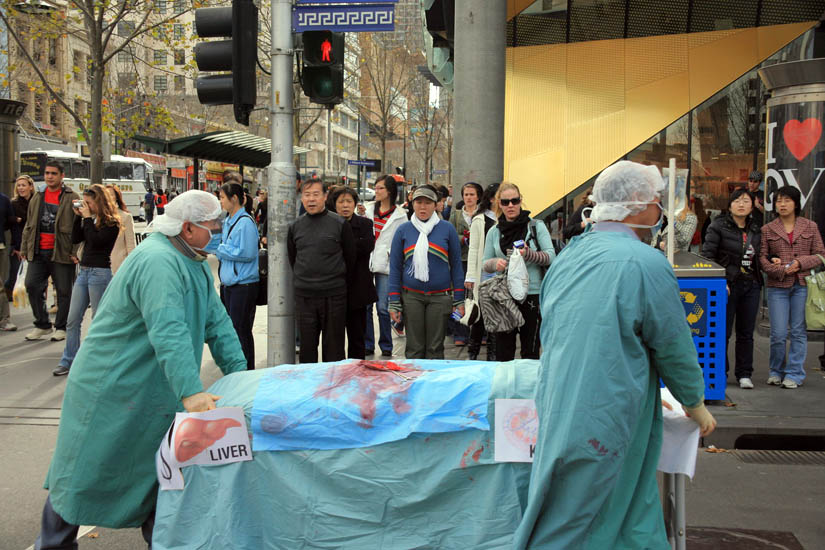 At the destination of the march, Federation Square, the practitioners set up anti-torture poster boards and a reenactment of the live organ harvesting.