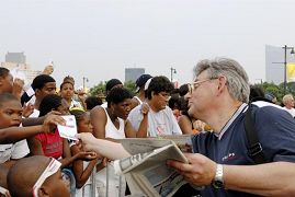 (Clearwisdom.net) Independence Day is a big celebration in Philadelphia, the birthplace of the Declaration of Independence. The eight-day-long celebration of the 230th anniversary of Independence Day ended with a joyous atmosphere of a traditional parade, a concert and fireworks on the evening of July 4, 2006. More than one million people from all over the world gathered along Ben Franklin Ave. to watch the parade. Falun Gong participated in the parade as the only Chinese-American group. The one-hundred-person Divine Land Marching Band showed its mighty bearing in the parade and won countless cheers from the parade spectators.
