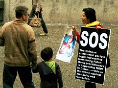 Some practitioners walked down the streets to a crossroad and held posters reading, "SOS" and photos of practitioners tortured to death in China. Many people stopped by and watched. Practitioner Yanchen He explained to people that her father, He Sanpu, was detained for practicing Falun Gong .