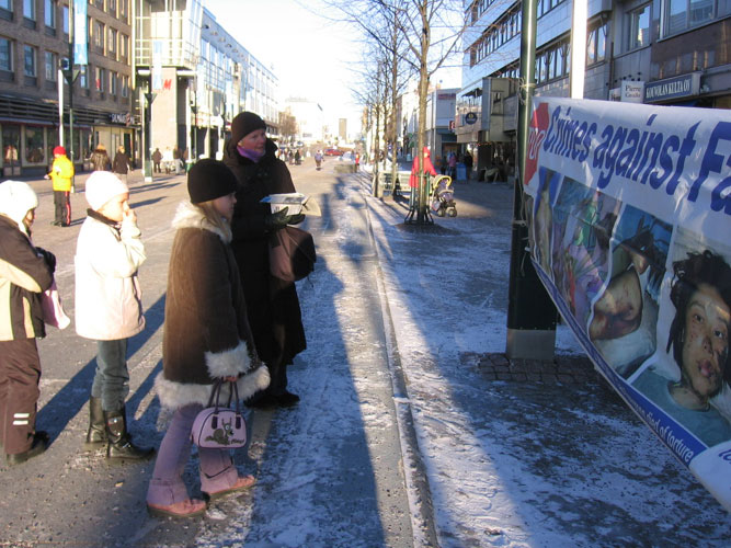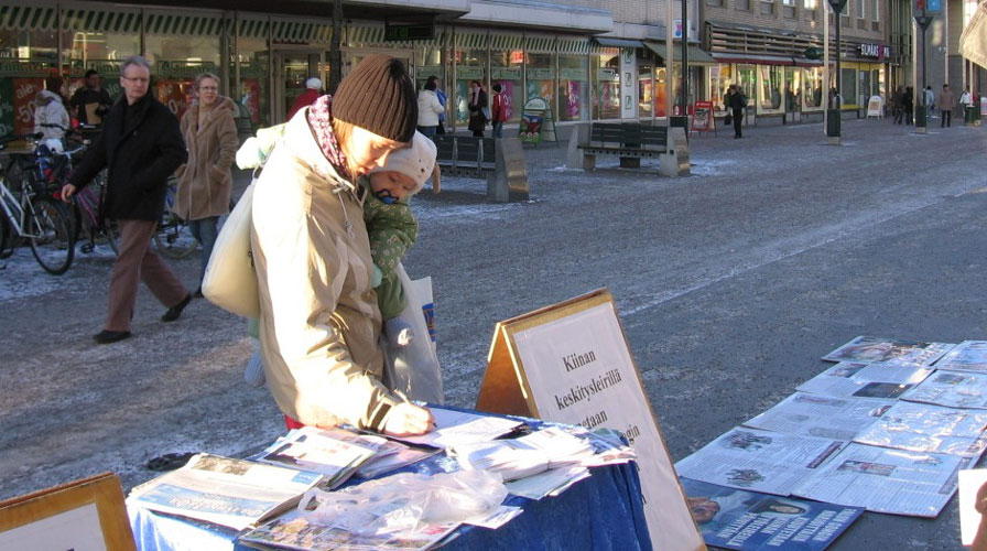 Wangfang, a practitioner living in Kouvola, learned recently that her mother in her hometown in northeastern China was arrested and her home was searched and property confiscated the day before. Although worried, she told herself to be strong, and she wanted to tell the Finnish people her mothers story. Her mother is a Falun Gong practitioner who tries to be a good person according to the principle "Truthfulness-Compassion-Forbearance." However, she was arrested with no legal procedures after being held in a labor camp for one year. Such things are happening to practitioners in China every day. The only way to stop it is to expose it. She gave a flyer to an elderly man and told him her story. He urged her to write out her mothers story and let the people, the Finnish Congress, the media, the police, and the international community know what is happening in China now. One Finnish lady's offer of financial support was politely declined. Several young students said that they could not understand why the police in China would arrest innocent people. Isnt it so true that the police arrest only the bad?