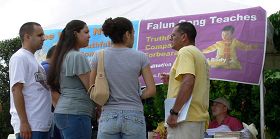 The event attracted up to ten thousand visitors. The Falun Gong booth happened to be at a three-way intersection, and most of the visitors passed it during the course of the day. Practitioners continuously demonstrated the five sets of exercises with the accompanying music. The poster boards and banners drew peoples' attention. Many of them asked questions out of curiosity, wondering what Falun Gong is. Quite a few of them said that they knew a little about Falun Gong and that the practice is banned in China. Some of them also knew that this is a very good practice, currently under the Chinese Communist Party's (CCP) persecution. They were familiar with practitioners' peaceful protests in New York and many other places. When practitioners patiently introduced Falun Gong and talked about the persecution, as well as the shocking fact of the CCP's harvesting organs from living Falun Gong practitioners, all visitors were shocked and indignant. Some of them had tears in their eyes when they learned about the persecution, and one woman even burst into tears.