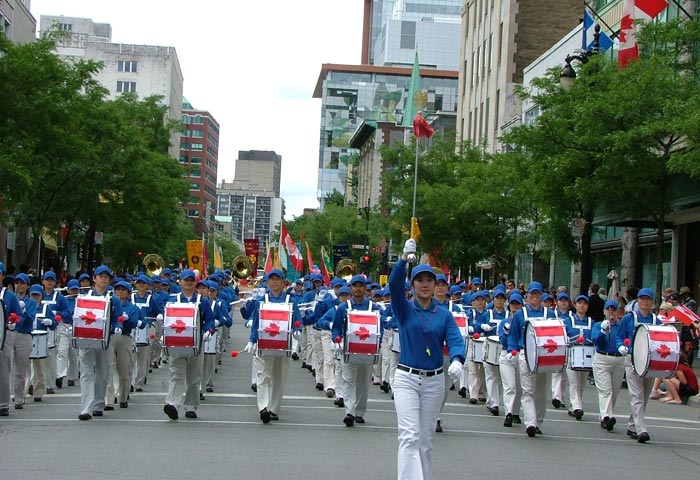 (Clearwisdom.net) July 1, 2007 marks the 140th birthday of Canada. To celebrate the event, a Canada Day Parade was held in Montreal. The organizer of the parade invited the Divine Land Marching Band and local Falun Gong practitioners to take part in the parade. Falun Gong practitioners' great performance won them the highest award of the parade--the President's Award. Their float, Celestial Maidens' dancing and waist drum troupe were warmly welcomed by the spectators.