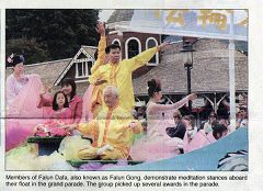 On August 8, the Snoqualmie Valley Record published a color photo of several practitioners who were demonstrating the Falun Gong exercises on a float during the parade. The caption on the picture said that the Falun Gong practitioners were demonstrating meditation on the float and that the group received a number of awards in the festival parade.