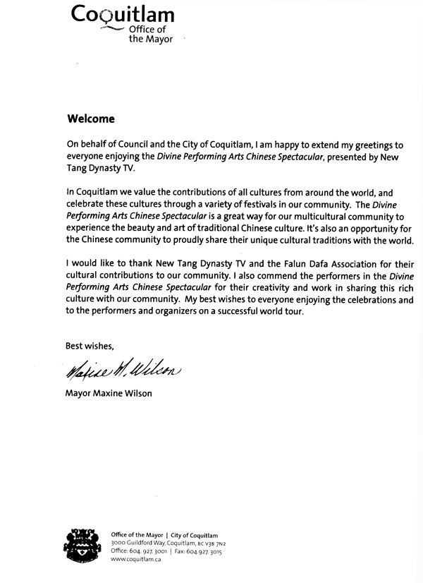 On behalf of the Council and the City of Coquitlam, I am happy to extend my greetings to everyone enjoying the Divine Performing Arts Chinese Spectacular, presented by New Tang Dynasty TV.