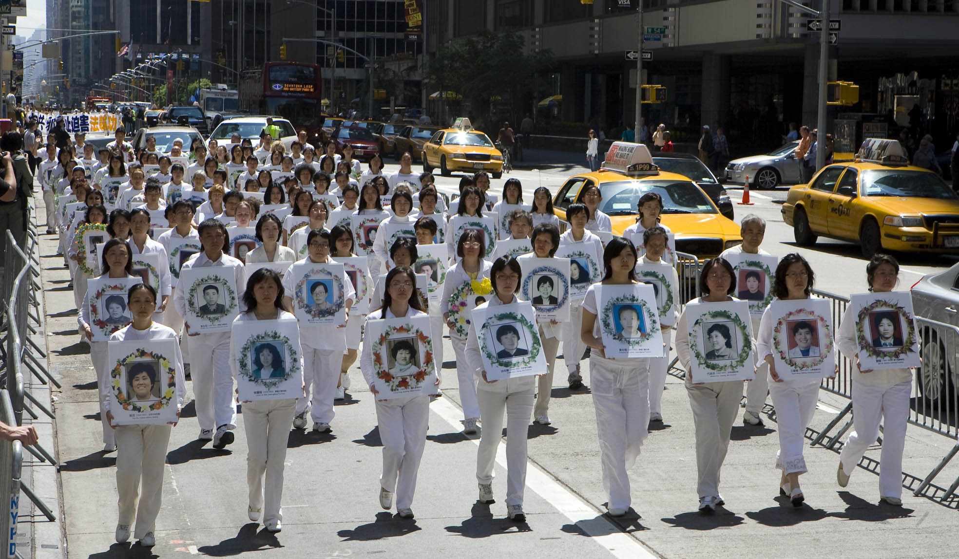 Hundreds of practitioners wearing white clothes and shoes walked slowly while holding photos of practitioners who have died as a result of the CCP's persecution.