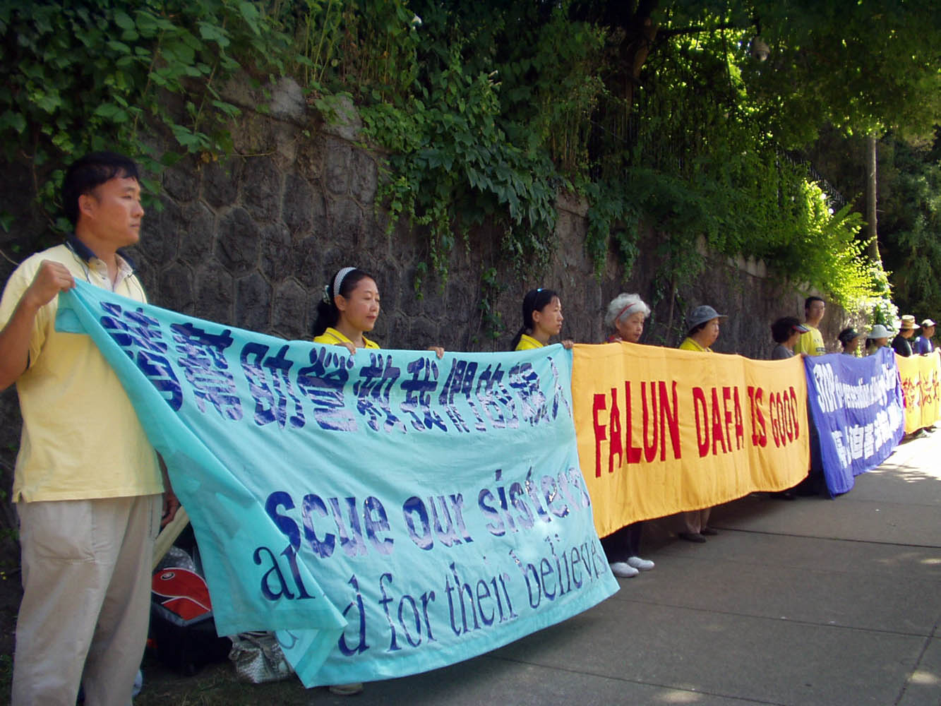 Mr. Chen Song (first left), Ms. Jing Tian (second left) and Ms. Jing Cai (third left) peacefully protest outside the Chinese Consulate