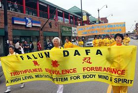 (Clearwisdom.net) On September 26, Falun Gong practitioners from the Midwestern US held a grand parade in Chicago's Chinatown to showcase the beauty of Falun Dafa, call for action to stop the persecution, and urge people to quit the Chinese Communist Party. People on the sidewalks and from the shops along Wentworth Avenue watched the parade.