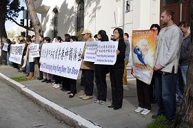 (Clearwisdom.net) On January 30, a rally was held in front of the Chinese Consulate in San Francisco, condemning the Chinese Communist Party (CCP) for exerting pressure on the Hong Kong government to deny the visa applications of six staff members in Shen Yun Performing Arts, which caused cancellation of the Shen Yun shows. The attendees also expressed support for the protest march "Protect Shen Yun; Protect Hong Kong" in Hong Kong on the same day. They requested the Hong Kong government to correct their wrong decision and invite Shen Yun back to Hong Kong.
