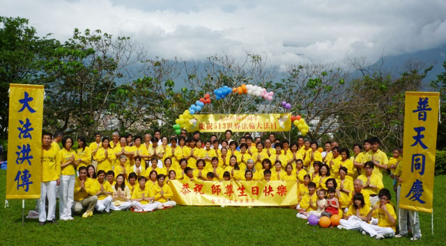 (Clearwisdom.net) On May 9, Falun Gong practitioners from Hualian, Taiwan, assembled at Meilun Mountain Park to celebrate the 11th World Falun Dafa Day. They expressed their appreciation to Master Li Hongzhi, the founder of Falun Gong, and demonstrated the beauty of Falun Gong to the public.