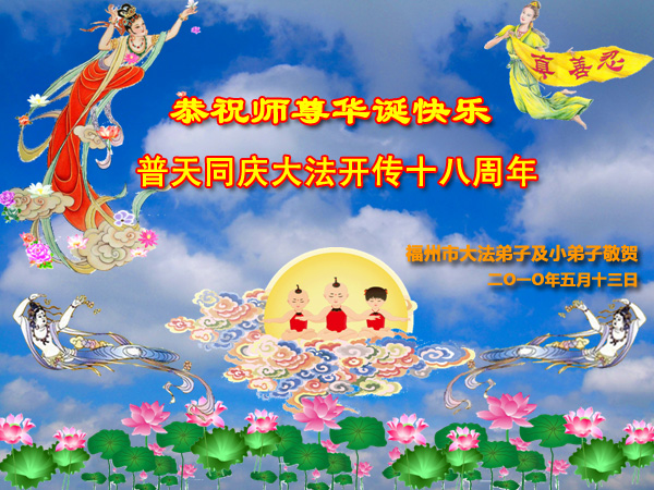 Adult and Young Practitioners from Fuzhou Celebrate the 18th Anniversary of Falun Dafa's Public Introduction and Respectfully Wish Revered Master Happy Birthday!