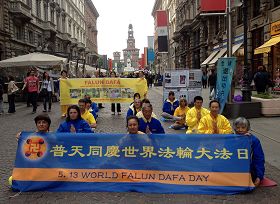 (Minghui.org) May 13, 2012 was World Falun Dafa Day and also the 20th anniversary of Falun Dafa’s public introduction to the world. On this day of celebration, Falun Gong practitioners in Italy held an event near a renowned, ancient castle (Castello Sforzesco). The day was also the 61st birthday of Master Li Hongzhi, the founder of Falun Gong.