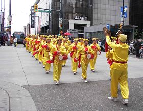 In Chinatown, the performances of the Divine Land Marching Band also attracted many Chinese. Many people took videos and pictures. Mr. Wu from China watched the entire event. He strongly condemned the persecution of Falun Gong, and praised practitioners for their peaceful resistance.