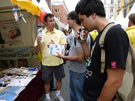 A young man from China, who is currently living in Denmark, came to the booth to speak with practitioners. From the conversation, it became clear that he had a misunderstanding about Falun Gong because of the CCP's propaganda. A practitioner talked with him patiently about traditional Chinese culture, religious belief, current crisis in China, and moral degradation in society at large. The practitioner also spoke about the CCP's slanderous propaganda and organ harvesting from living Falun Gong practitioners, and informed the young man that 120 million Chinese people have quit the CCP. The young man listened quietly, visibly becoming more relaxed and clear in the process. The conversation lasted more than half an hour.