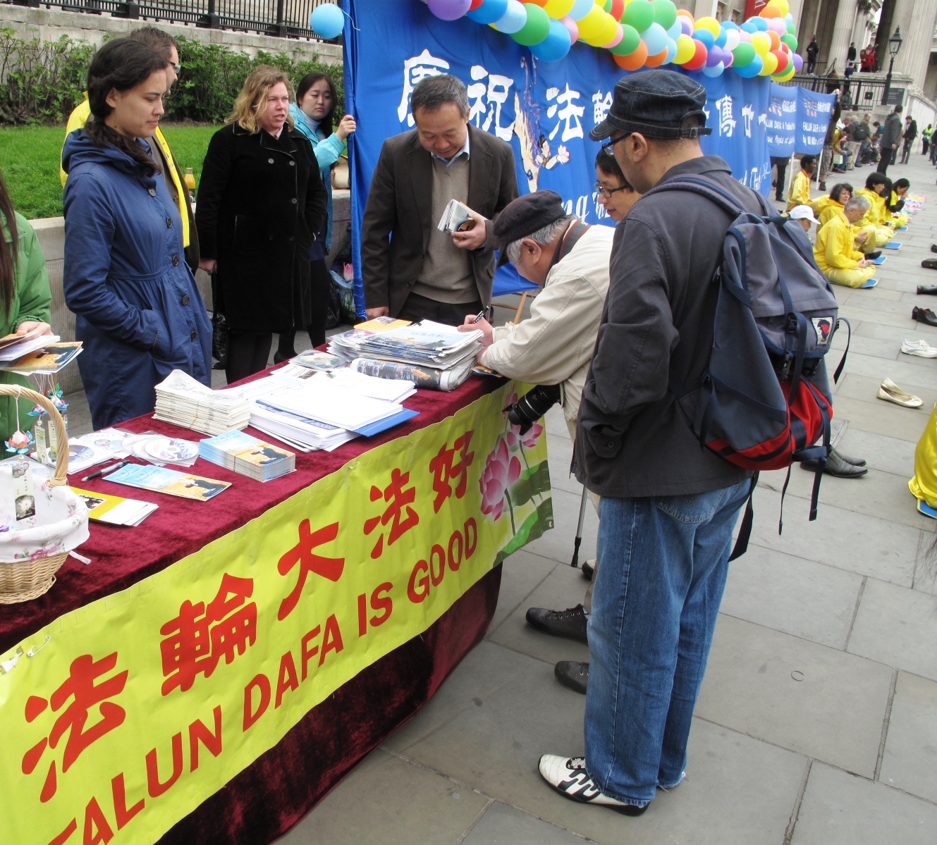 Falun Gong practitioners dressed in yellow exercise suits demonstrated the five sets of exercises along to peaceful music. Trafalgar Square was very busy over the weekend, and people were constantly stopping by to watch the exercise demonstration and to learn about Falun Gong.