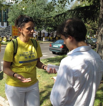 (Minghui.org) “We have been peacefully protesting the persecution of Falun Gong in China for over ten years. This persecution will some day be remembered as a shameful chapter in China's history. You work in the embassy and don't want to be scapegoats of the Chinese Communist Party (CCP). Please withdraw your membership from the Party.”