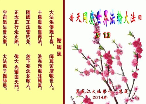 (Minghui.org) Practitioners from the following areas of Heilongjiang Province, China, celebrate World Falun Dafa Day and the 22nd anniversary of Falun Dafa's introduction to the public! Respectfully wishing revered Master a Happy Birthday!