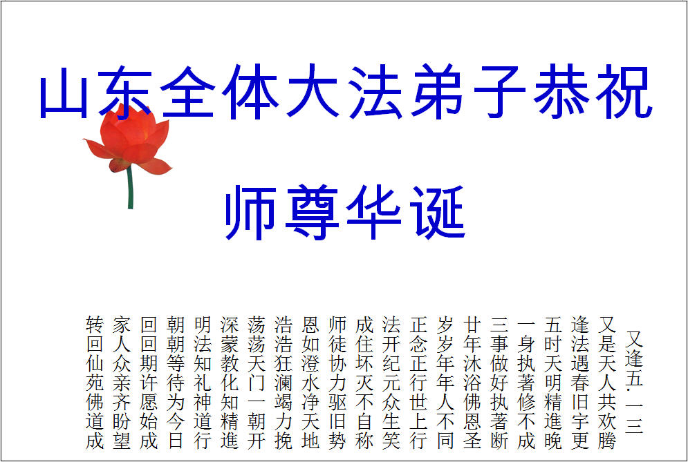 (Minghui.org) Practitioners from Shandong Province, China celebrate World Falun Dafa Day and the 22nd anniversary of Falun Dafa's introduction to the public! Respectfully wishing revered Master a Happy Birthday!