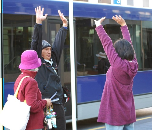 The celebration in downtown Auckland attracted many tourists. An elderly Maori lady watched the exercise demonstration for a long time. She said to the practitioners, “It is great that you bring such beautiful exercises here. I support Truthfulness-Compassion-Forbearance. Our Maori people have similar principles. I think that we were Chinese people long ago, too.”